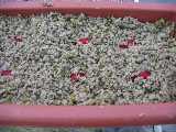 4月28日 いちごの作業も落ち着いてきたので、種から育てるいちごに挑戦すべく完熟のいちごを1個摘み取り、この種を使用することにしてみました。品種は「女峰」です。 まず、いちごの実を八等分し、表皮の部分が上になるようにプランターの培地の上に並べ、いちごが見え隠れするように覆土をしました。 この後は、親苗の管理と同じように、養液を供給しながら発芽を待ちたいと思います。 培地は土を使わず、親苗と同じ「ロックウール」を使用しました。 果たしてどんなふうになるのでしょうか。全く予想がつきません。 |